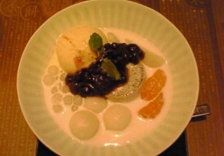 ぐりは、黒ごまプリンのあんみつ。ぐりパパはクリームあんみつ。