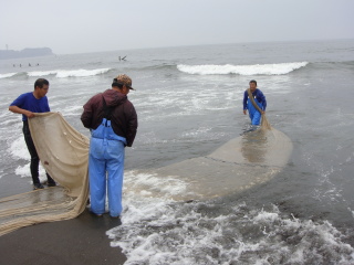 漁師さんは、肩ぐらいまで海に入り、網を引いてくれていました。