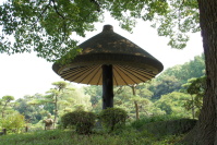 芭蕉の句碑『古池や かはづ飛び込む 水の音』 キノコのような『傘亭』 何か、可愛い(*^_^*)