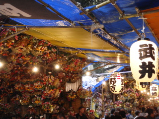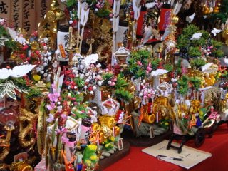 熊手や縁起物がズラリと並んでいます。