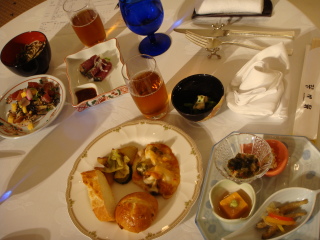 ワカサギの南蛮漬け、雲丹豆腐、からし菜おひたし、卯の花和え、