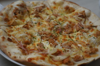 『ボン・グゥ』にて。 タルトフランベ(ツナとミョウガ) タルトフランベって、フランスアルザス地方の郷土料理だとか。 見た目、ピザっぽいね。