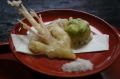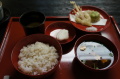 『堯心亭』にて。 ●揚物 しゃか揚 茗荷子 谷中生姜 ●飯椀 麦飯とろろ ●小皿 香の物 ●汁椀 赤だし汁 ●甘味 水万頭