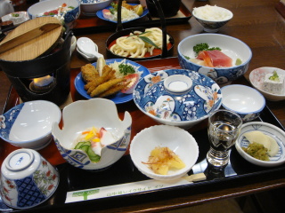 保養所にて。 本日の夕飯。 テーブルいっぱいに並んでます(*^_^*) 食べられるかなぁ〜なんて心配したけど・・・ 大丈夫だった(笑) ●牛すき鍋 ●ワカサギとカキのフライ ●お刺身(マグロ・ホタテ・甘海老) ●煮物 ●酢の物 ●数の子 ●忍野八海の水を使った、ゴマ豆腐