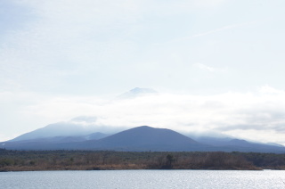 精進湖にて。 初めての精進湖、そして、精進湖と富士山。 着いた時は、こんな感じで、富士山がキレイに見えなかったんだけど・・・