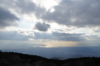 三国峠にて。 相模湾上空の、天使のはしご(薄明光線)。