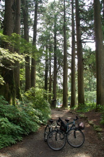 チャリンコを押しながら、杉木立を歩きました。