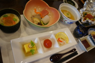 とうもろこし豆腐・サーモンと夏蕪のマリネ・葛もちトマト
