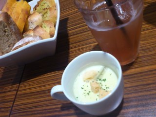 今日のお品書き。 このイベントオリジナルプレートとドリンク、そして、焼きたてのパン! ●鴨胸肉のローストと旬の野菜のサラダ菜園風 レモンと生姜のドレッシング ●枝豆のポタージュ ●メゾンカイザーパン ・柚子のパン(全粒粉) ・キュルキュマ ・サツマイモ ・トッサードトマト ●炭酸水とフランボワーズビネガー