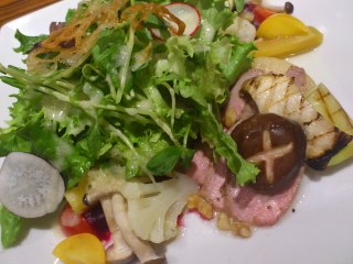 こちらが、オリジナルプレート。 鴨胸肉のローストと旬の野菜のサラダ菜園風 レモンと生姜のドレッシング ぐりパパ、長ネギと椎茸を頑張って食べたみたいっ!
