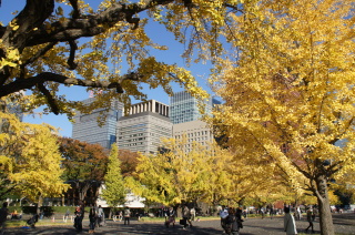 いちょう並木の奥には、皇居が見えるよ。