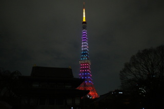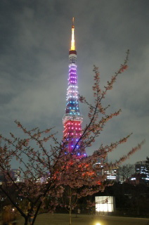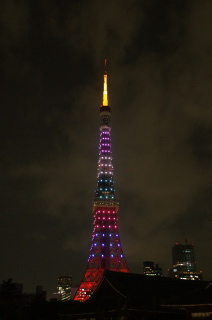 東京タワーのライトアップが、ビルに映ってるよぉ〜
