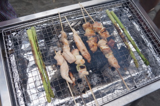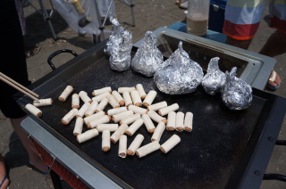 お隣のバーベキューコンロ・・・ ポークピッツを餃子の皮で巻いてるみたい。