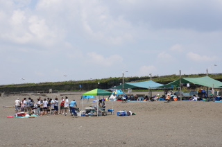 全体図はこんな感じ〜。 ほとんどの人は、テントの下で焼きあがるのを待ってる感じ(笑) 今回、バーベキューコンロ、6台だったかなぁ・・・