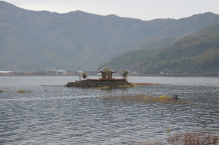 河口湖に着いてすぐ、どうしても見に行きたかった、六角堂。 水位が戻ったみたいで、近くまで行けなかった・・・