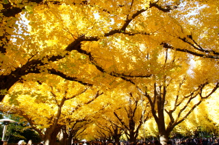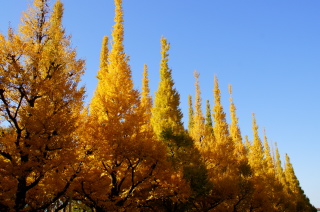 昭和記念公園のいちょう並木は、四角く(?)剪定されていたけれど、 神宮外苑のいちょう並木は、とんがってるね。