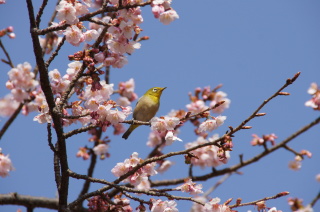 寒桜に、メジロがたくさん遊びに(?)きていました。