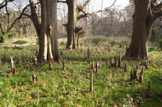 これ、ちょっと不気味(?)な感じだけれど・・・ 『落羽松(ラクウショウ)』っていう、スギ科ヌマスギ科の木で、 ”気根”が出てるんよ。 ここから、呼吸してるんだって!