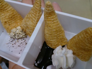 『ハウス食品』のブースで試食した、とんがりコーン。 マヨネーズと生クリームの食べくらべ。