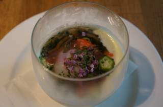 小海老となめこ、オクラ、温泉卵のコンソメクープ〜ほんのり梅風味