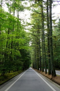 三笠通り。 カラマツ並木がキレイ! この通り沿いには、大きな別荘がズラリ〜