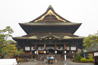 善光寺の山門。 「善光寺」と書かれた額は、通称「鳩字の額」と呼ばれていて、 3文字の中に鳩が5羽隠されているんだって!