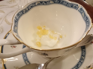 『栗の木テラス』にて。 ぐりの栗の紅茶。 甘くない生クリームと栗の上に紅茶が注がれたよ。