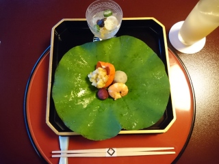 はすの葉に 山桃、海老うに和え、とうもろこしの揚物、里芋。 グラスに入ったモノは、たこ白木耳酢。