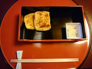 あげ田楽。 ネギをのせていただきました。 ぐりパパ、「このネギは食べれる」って食べてたよ!