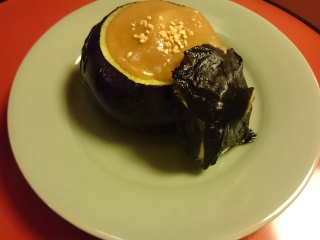 加茂なす胡麻和え 加茂なすが器になっていて、中に一口大くらいのなすが入ってたよ。 ちなみに、この器の加茂なすも、素揚げされてたので、食べられたよ。