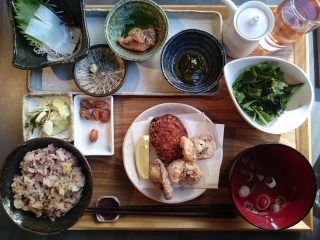 島めぐりランチ御膳。 ・本日の島のお造り ・八丈島のムロアジメンチカツ ・淡路島のタコのから揚げ ・保戸島のひゅうが(マグロの漬け) ・隠岐島のもずくの酢の物 ・隠岐島・海士の塩の浅漬け ・徳之島のみそ豆 ・種子島の安納芋ごはん ・利尻島のお吸物