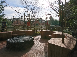 『キャンプ・ウッドチャック』のテラス席。 キャンプ場のBBQ広場みたい・・・