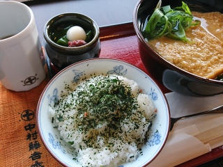 『中村藤吉』にて。 茶そばを食べたよ。 手前のごはんにのってるのは、お茶の葉のふりかけ。