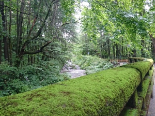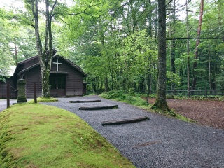先輩夫婦と合流する前に、軽くサイクリング。 ショー記念礼拝堂。 雨上がりのコケの感じ、いいね。