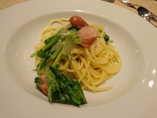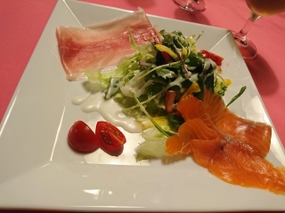 本日のお宿『軽井沢ジャルディーノ』での晩ごはん。 冷製オードブル〜サーモンと白身魚のマリネ、ブーケ仕立て 温製オードブル〜カプレーゼ温製仕立て、生ハム添え