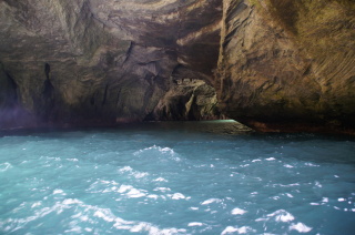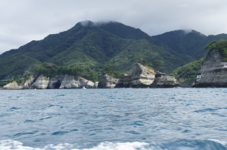 堂ヶ島へ。 洞窟めぐりをしよう!ということになり、遊覧船に乗ったけど・・・ まぁまぁ波がある。