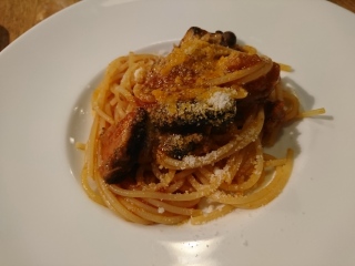 ぐり&ぐりパパの前菜2品目。 パスタ。 茸の入った牛肉のミートソーススパゲティ