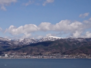 諏訪湖SAにて。 ここ1周したよなぁ、アシストなしの折畳み自転車で。