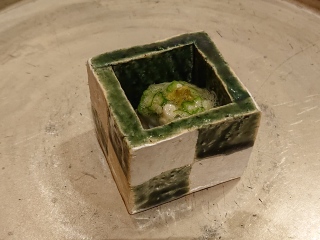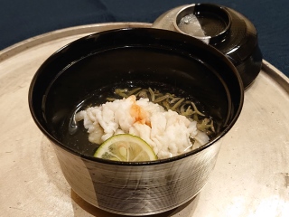 鱧とジュンサイのお吸い物 ウニと帆立のにぎり