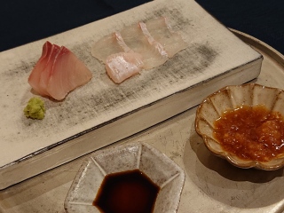 かんぱち・ヒラメのお造り 湯葉と水ナスの揚げだし