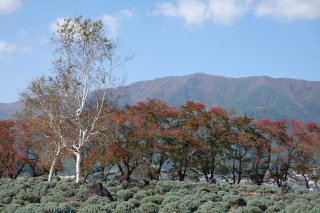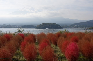 お気に入りのパン屋さんの開店待ちの間・・・ コキアと富士山。 この前の台風で、コキアが”終わった”らしい。