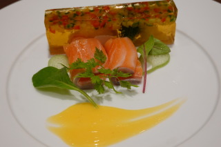 お宿の晩ごはん。 『蓼科コース』 前菜・・・夏野菜のゼリー寄せ スープ・・・オマール海老の冷製スープ