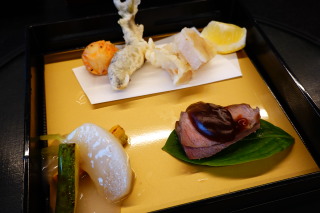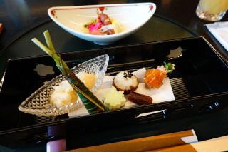 お宿の晩ごはん。 先付 炙り帆立と蛍烏賊の海苔酢あんかけ、線野菜、なた豆の花 前菜 白身魚の南蛮漬け、楓チーズ、石川小芋衣かつぎ、 蕗山葵、粽麩、芽巻き合鴨