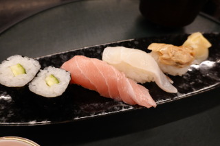 お宿の晩ごはん 握り寿司(中トロ、鯛、煮蛤) デザート