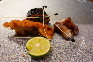 さんまの味醂干し、松茸のフライ、イノシシの焼物