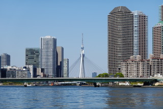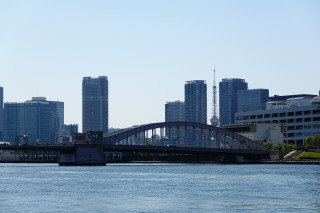 佃大橋〜勝鬨橋までの間、左を見れば、東京タワー。 右を見れば、スカイツリーのスポットがあって・・・ これは、右を見た図。 スカイツリーが被ってるのは、中央大橋。 その手前が、佃大橋。
