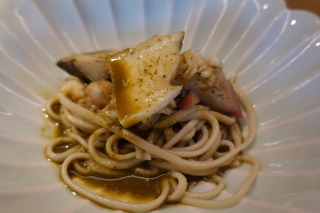 ●いかそうめん〜オリーブオイルとカラスミ〜うるいと蕨のせ ●鮪と春日鯛のにぎり