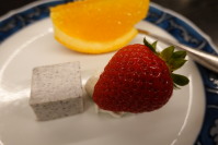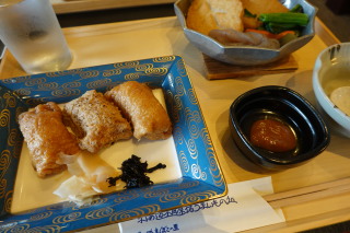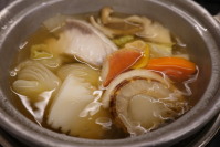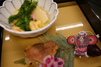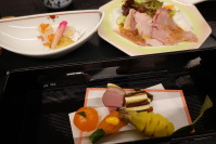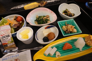 お宿の朝ごはん 籠清のかまぼこ、伊豆の山葵漬、明太子、有機野菜のサラダ ほうれん草のおひたし、ひじき、鶏皮ぽん酢和え、豚汁