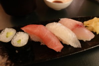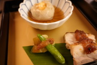 海老芋万頭、地鶏味噌焼、焼きナス にぎり寿司